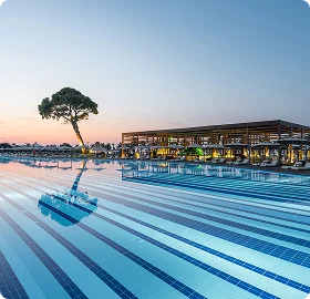 Отель окружает сосновый лес, благодаря которому сам воздух напитан ароматом хвои, и заниматься спортом здесь — одно удовольствие. Посетителям всех возрастов предлагают на выбор более 20 активностей, которые можно сочетать с купанием, дневной развлекательной программой, а также вечерними выступлениями диджея, артистов и живой музыкой.