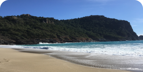 Славится живописными видами: зелеными скалами, кедровыми лесами и лазурным морем. По легенде, его подарил Клеопатре Марк Антоний, приказав засыпать пляж песком из дельты Нила.